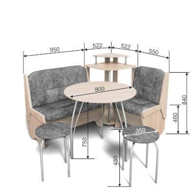 Оригинальный кухонный уголок Лотос отличается от других похожих кухонных гарнитуров. Он состоит из двух отдельных диванчиков и этажерки, заменяющей угловую мягкую часть. Круглый кухонный стол в отличие от других наборов мебели на металлическом основании как и два круглых табурета. Набор мебели для кухни включающий в себя большую прямую скамью,малую прямую скамью,угловую этажерку, стол на металлических ногах и два табурета на металлокаркасе. В прямых скамьях под сиденьями расположены ящики.